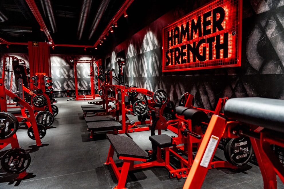 Hammer Strength Plate Loaded och Life Fitness styrkeutrustning, som ger möjlighet till strukturerad progression och tydlig vägledning i träningspassen.
