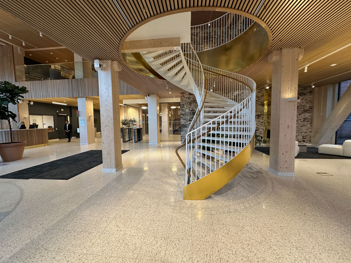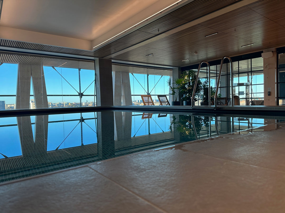 Själva byggnaden har en stomme av korslimmat trä och limträ, där limträbalkarna syns genom den glasade fasaden, vilket framhäver träets både strukturella och estetiska kvaliteter. Högst upp ligger gymmet och precis intill finns pool, bastu och generösa relaxytor – alla ytor med samma vidsträckta utsikt över Stockholm.