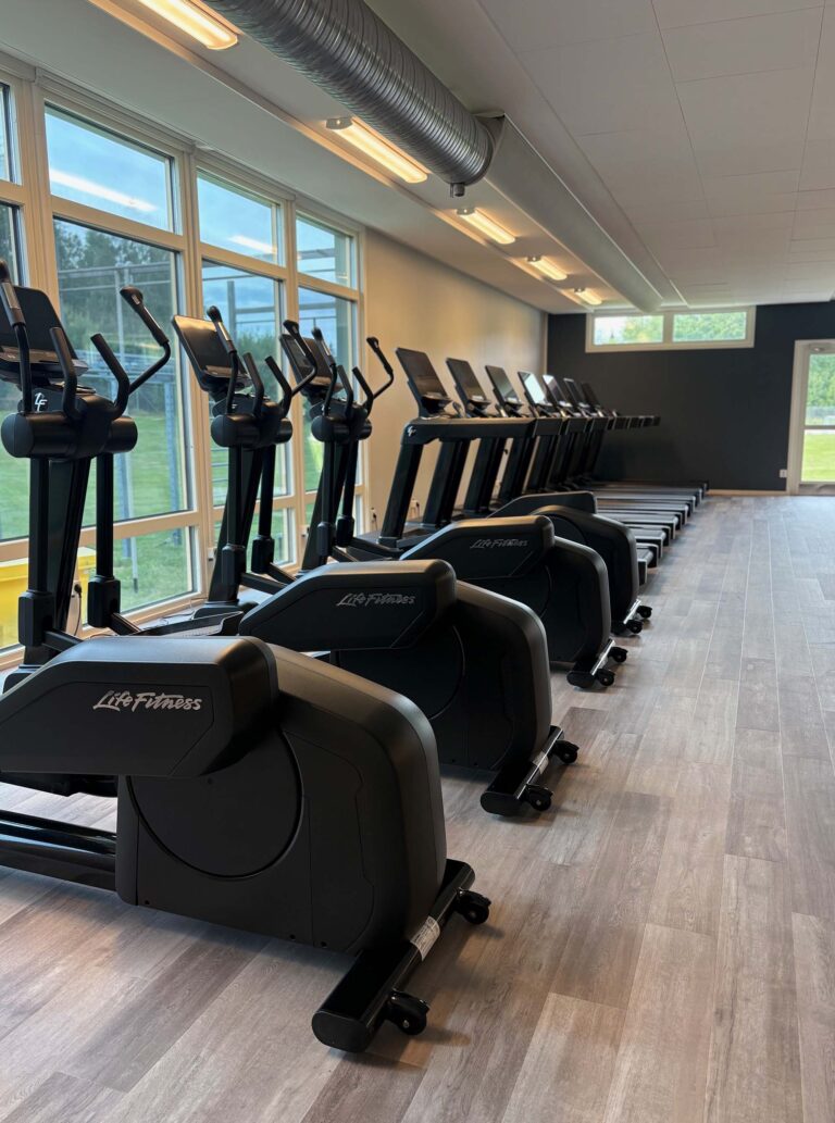 Tydlig profil med egendesignad belysning och akustikriktat ljud. Enhetligt utseende genom tydliga färgkoder med den speciella blå färgen som går igenom i inredning samt på utrustningen från Life Fitness och Hammer Strength.